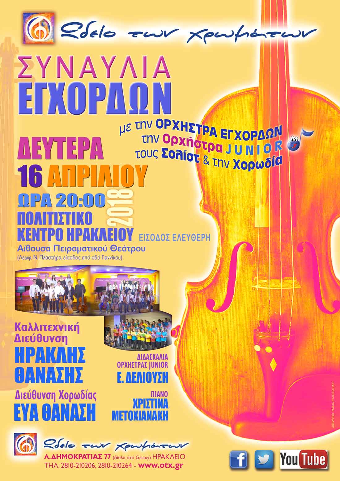 Μία νέα συναυλία, με το ΣΥΝΟΛΟ ΕΓΧΟΡΔΩΝ, την Ορχήστρα JUNIOR, τους Σολίστ & την Χορωδία του "Ωδείου των χρωμάτων" ετοιμάζεται....!ΣΥΝΑΥΛΙΑ ΕΓΧΟΡΔΩΝ του "Ωδείου των χρωμάτων", Δευτέρα 16 Απριλίου 2018, στις 20:00, στο "Πολιτιστικό Κέντρο Ηρακλείου", Λεωφ. Ν. Πλαστήρα (Αίθουσα “Πειραματικού Θεάτρου), με το Μουσικό Σύνολο Εγχόρδων, την Ορχήστρα JUNIOR, τους Σολίστ & τη Χορωδία του "Ωδείου των χρωμάτων".