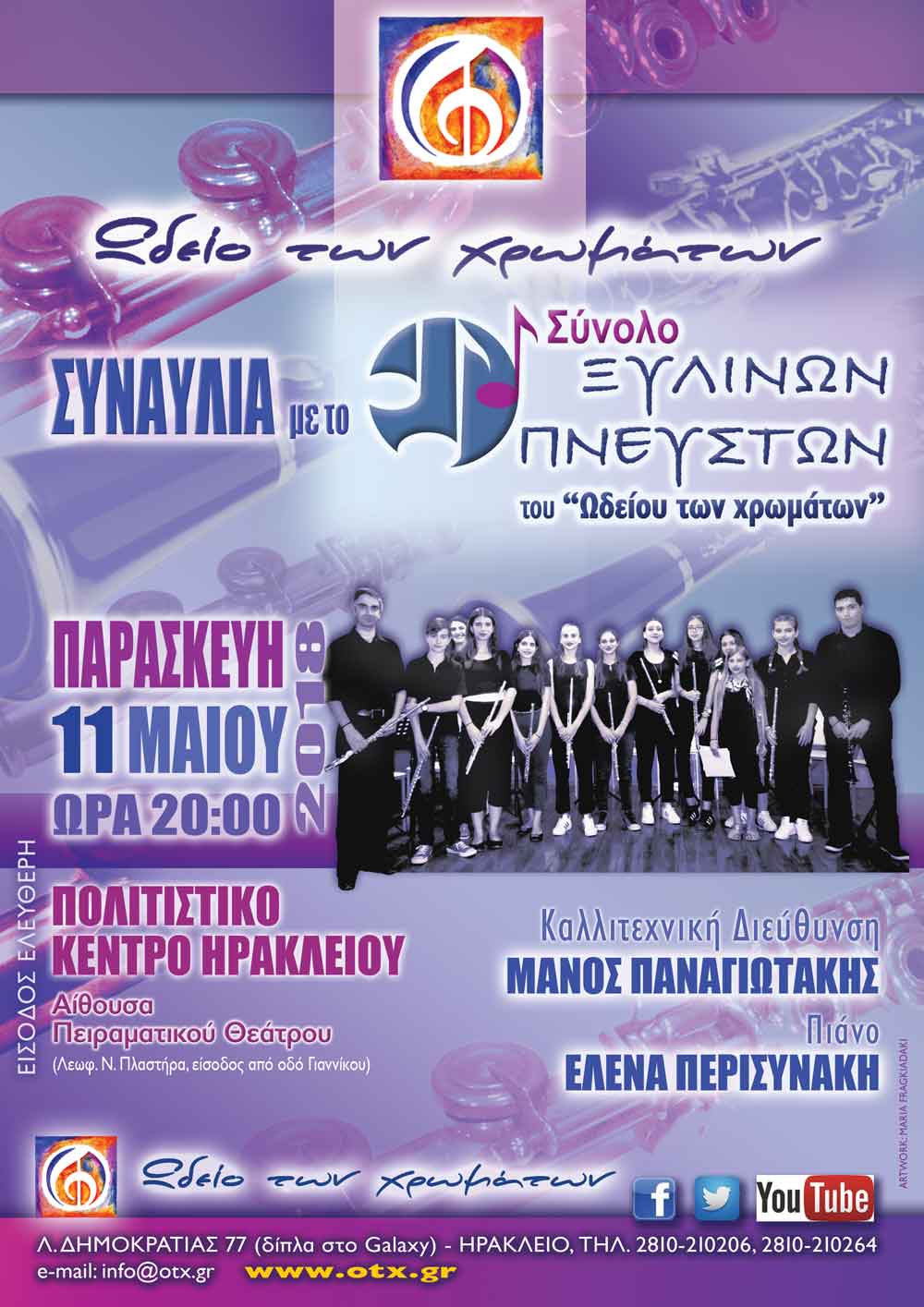 ΣΥΝΑΥΛΙΑ ΞΥΛΙΝΩΝ ΠΝΕΥΣΤΩΝ του “Ωδείου των χρωμάτων”, Παρασκευή 11 Μαΐου 2018, στις 20:00, στο “Πολιτιστικό Κέντρο Ηρακλείου”, Λεωφ. Ν. Πλαστήρα (Αίθουσα “Πειραματικού Θεάτρου”), με το Σύνολο ΞΥΛΙΝΩΝ ΠΝΕΥΣΤΩΝ του “Ωδείου των χρωμάτων”.