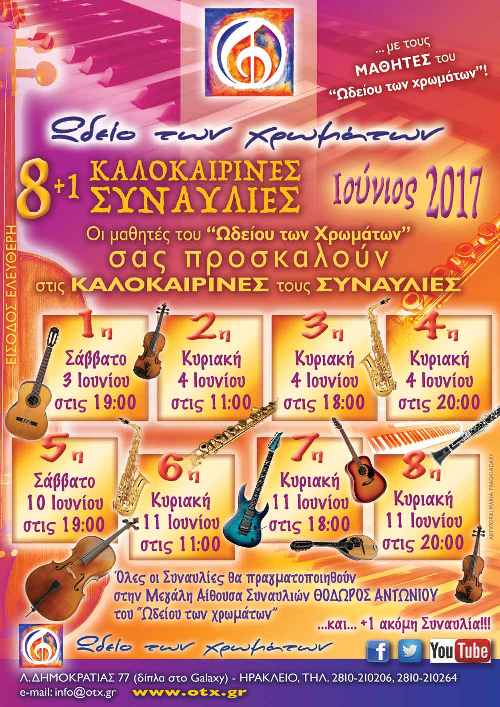 Θα πραγματοποιηθούν όλες στην Μεγάλη Αίθουσα Συναυλιών "ΘΟΔΩΡΟΣ ΑΝΤΩΝΙΟΥ" στο "Ωδείο των χρωμάτων", Λ. Δημοκρατίας 77 στο Ηράκλειο.
