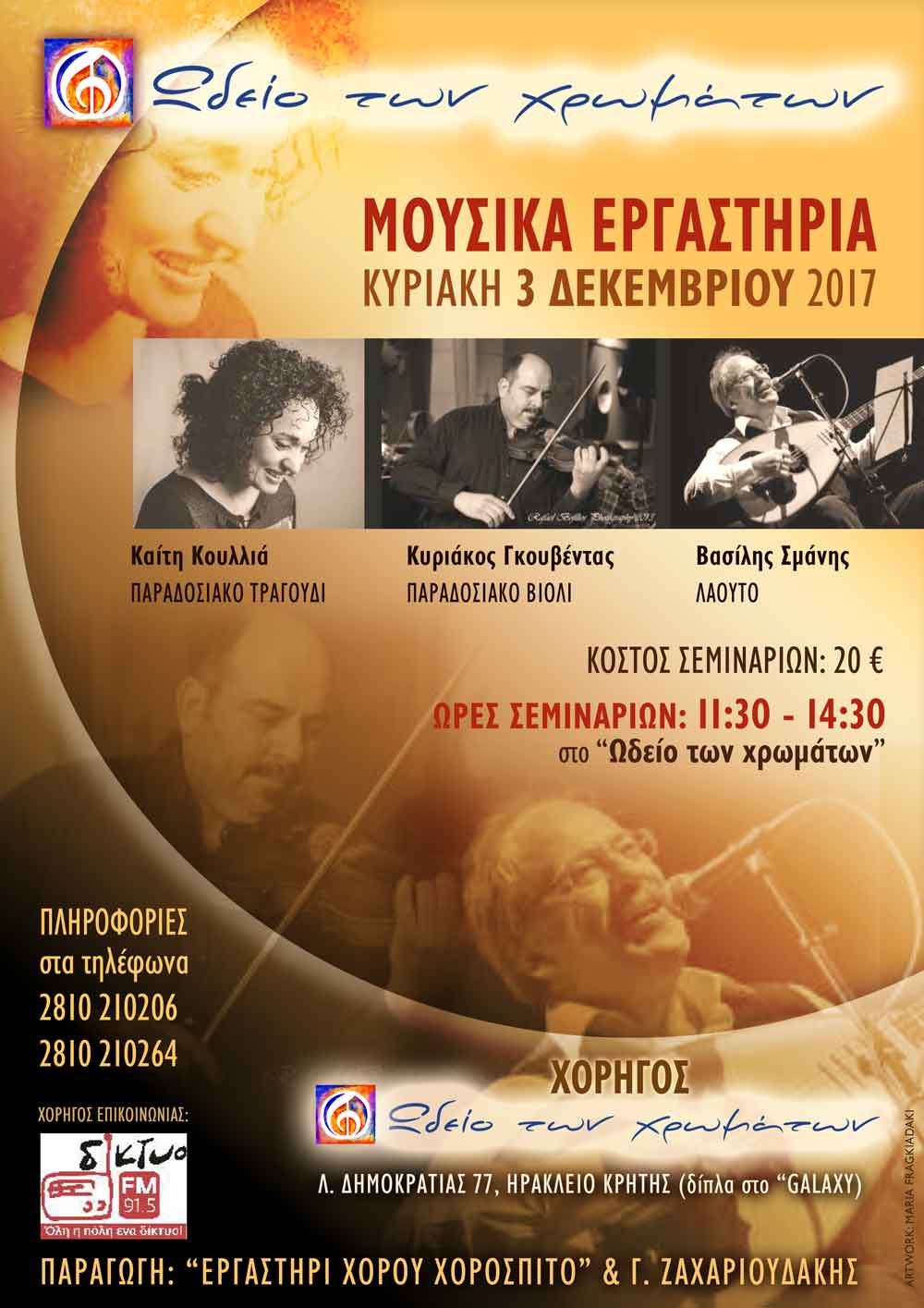 Το "Ωδείο των χρωμάτων" ως χορηγός αυτή τη φορά, πραγματοποιεί ΣΕΜΙΝΑΡΙΑ / ΜΟΥΣΙΚΑ ΕΡΓΑΣΤΗΡΙΑ με 3 εκλεκτούς καλεσμένους: η Καίτη Κουλλιά θα παρουσιάσει Αιγαιοπελαγίτικο ΠΑΡΑΔΟΣΙΑΚΟ ΤΡΑΓΟΥΔΙ, ο Κυριάκος Γκουβέντας θα δείξει ΠΑΡΑΔΟΣΙΑΚΟ ΒΙΟΛΙ, ενώ ο Βασίλης Σμάνης θα δείξει νησιώτικο ΛΑΟΥΤΟ. Τα ΣΕΜΙΝΑΡΙΑ θα πραγματοποιηθούν την Κυριακή 3 Δεκεμβρίου το πρωΐ 11:30 - 14:00 στο "Ωδείο των χρωμάτων".Λίγα λόγια για τους καλεσμένους μας: