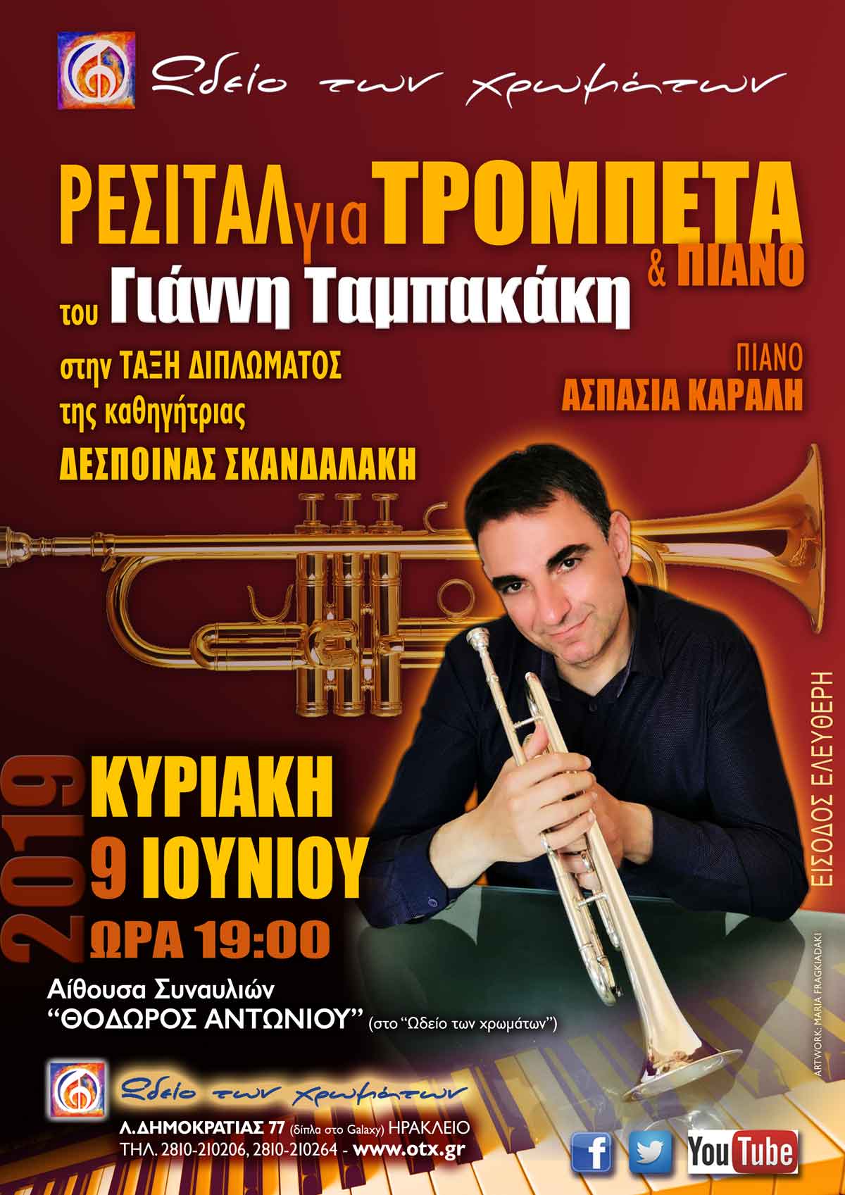 Νέο ΡΕΣΙΤΑΛ, αυτή τη φορά με ΤΡΟΜΠΕΤΑ στο "Ωδείο των χρωμάτων"!!! Την Κυριακή 9 Ιουνίου, στις 19:00, σας περιμένουμε ΟΛΟΥΣ στην Αίθουσα Συναυλιών "ΘΟΔΩΡΟΣ ΑΝΤΩΝΙΟΥ" (στο Ωδείο) για ν ακούσουμε τον ΓΙΑΝΝΗ ΤΑΜΠΑΚΑΚΗ στην ΤΡΟΜΠΕΤΑ (στην τάξη Διπλώματος, της καθηγήτριας του "Ωδείου των χρωμάτων" ΔΕΣΠΟΙΝΑΣ ΣΚΑΝΔΑΛΑΚΗ) με συνοδεία ΠΙΑΝΟΥ με την επίσης καθηγήτρια του "Ωδείου των χρωμάτων" ΑΣΠΑΣΙΑ ΚΑΡΑΛΗ.