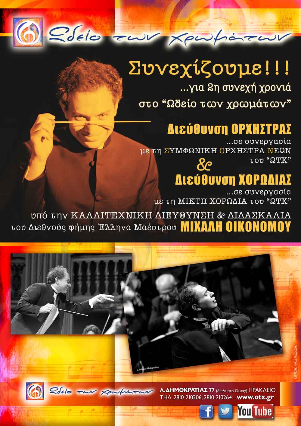 Συνεχίζουμε για 2η συνεχή χρονιά στο "Ωδείο των χρωμάτων", τη Σχολή Διεύθυνσης Ορχήστρας & Χορωδίας με τον Διεθνούς φήμης Συνθέτη/Μαέστρο, Διευθυντή Ορχήστρας ΜΙΧΑΛΗ ΟΙΚΟΝΟΜΟΥ.Στα μαθήματα, συγκεκριμένες Κυριακές του χρόνου, συμμετέχουν η Μικτή ή η Νεανική Χορωδία της Περιφερειακής Ενότητας Ηρακλείου υπό την καλλιτεχνική διεύθυνση της Λένας Χατζηγεωργίου. Τα μαθήματα συνεχίζονται κάθε μήνα, σε όλη τη διάρκεια της χρονιάς και για όποιον ενδιαφέρεται μπορεί να συμμετέχει, ενημερώνοντας τη γραμματεία του "Ωδείου των χρωμάτων" στα τηλέφωνα: 2810210206 & 2810210264.