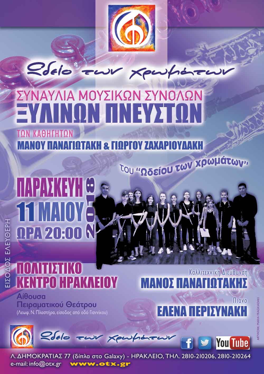 ΣΥΝΑΥΛΙΑ ΞΥΛΙΝΩΝ ΠΝΕΥΣΤΩΝ του “Ωδείου των χρωμάτων”, Παρασκευή 11 Μαΐου 2018, στις 20:00, στο “Πολιτιστικό Κέντρο Ηρακλείου”, Λεωφ. Ν. Πλαστήρα (Αίθουσα “Πειραματικού Θεάτρου”), με το Σύνολο ΞΥΛΙΝΩΝ ΠΝΕΥΣΤΩΝ του “Ωδείου των χρωμάτων”.