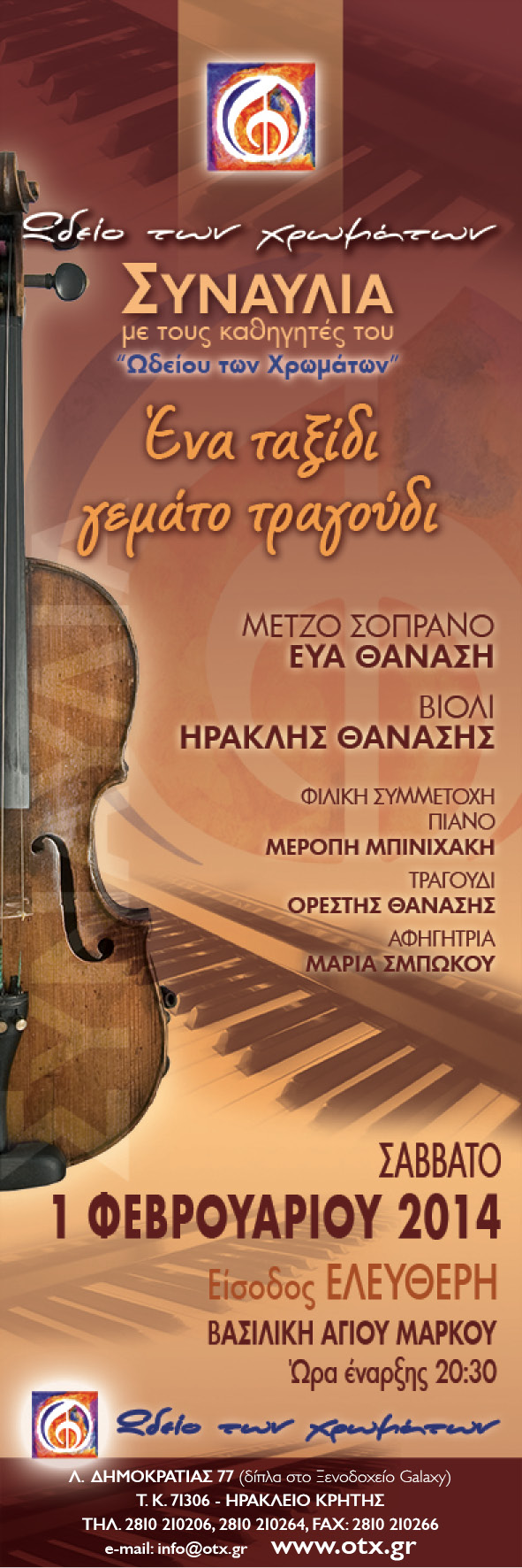 Σας ανακοινώνουμε την 2η ΣΥΝΑΥΛΙΑ του ΚΥΚΛΟΥ ΣΥΝΑΥΛΙΩΝ 2013 - 2014, που διοργανώνει το "Ωδείο των Χρωμάτων", η οποία θα πραγματοποιηθεί το Σάββατο 1 Φεβρουαρίου 2014, στη Βασιλική του Αγίου Μάρκου στο Ηράκλειο, στις 20:30. Συναυλία, με τίτλο 'Ένα ταξίδι γεμάτο τραγούδι" με τους καθηγητές του ωδείου μας κ. ΕΥΑ ΘΑΝΑΣΗ Μέτζο Σοπράνο & τον κ. ΗΡΑΚΛΗ ΘΑΝΑΣΗ στο βιολί. Φιλική συμμετοχή της κ. Μερόπης Μπινιχάκη στο πιάνο & ο Ορέστης Θανάσης στο τραγούδι. Σας περιμένουμε όλους! Είσοδος ελεύθερη. |