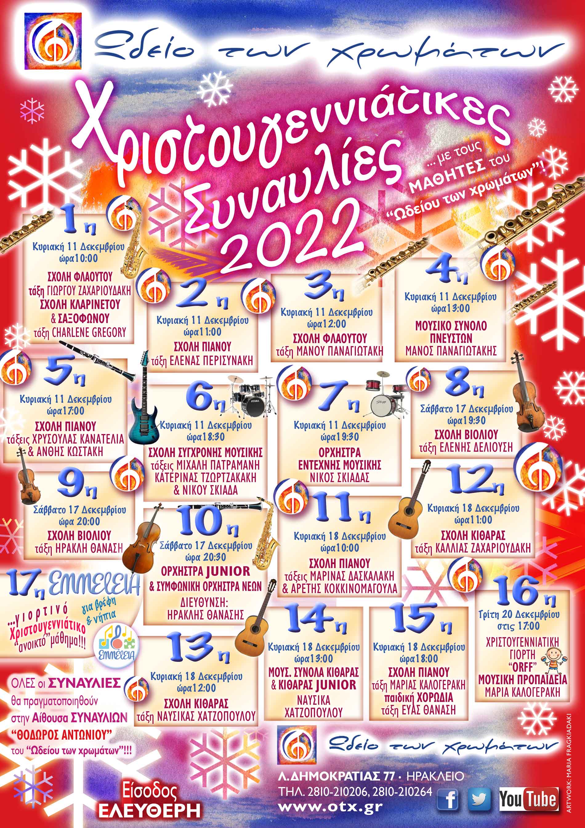 Φέτος, οι Συναυλίες μας, θα γίνουν όλες, την Κυριακή 11/12, το Σάββατο 17/12 και την Κυριακή 18/12/2022, στην Μεγάλη Αίθουσα Συναυλιών "Θόδωρος Αντωνίου"!