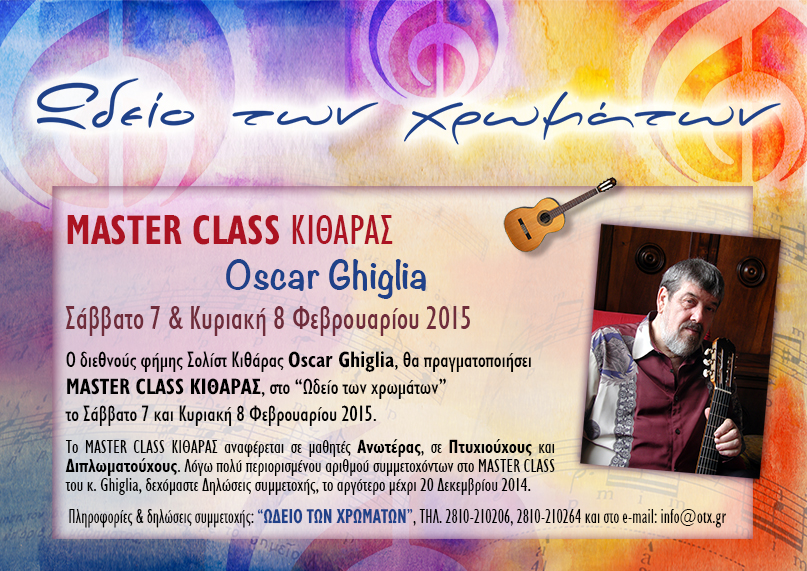 O διεθνούς φήμης Σολίστ Κιθάρας Oscar Ghiglia, θα πραγματοποιήσει MASTER CLASS ΚΙΘΑΡΑΣ, στο “Ωδείο των χρωμάτων” το Σάββατο 7 και Κυριακή 8 Φεβρουαρίου 2015.Το MASTER CLASS ΚΙΘΑΡΑΣ αναφέρεται σε μαθητές Ανωτέρας, σε Πτυχιούχους και Διπλωματούχους. Λόγω πολύ περιορισμένου αριθμού συμμετοχόντων στο MASTER CLASS του κ. Ghiglia, δεχόμαστε Δηλώσεις συμμετοχής & κρατήσεις θέσεων, το αργότερο μέχρι 20 Δεκεμβρίου 2014.