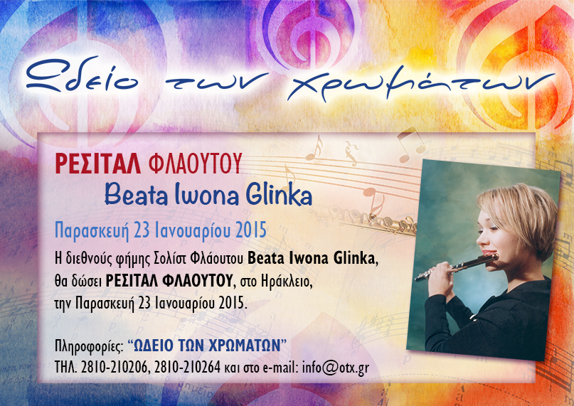 Η διεθνούς φήμης Σολίστ Φλάουτου Beata Iwona Glinka, θα δώσει ΡΕΣΙΤΑΛ ΦΛΑΟΥΤΟΥ, στο Ηράκλειο, την Παρασκευή 23 Ιανουαρίου 2015. Η Beata Iwona Glinka γεννήθηκε στο Kwidzyn της Πολωνίας. Σε ηλικία 18 ετών πήρε δίπλωμα φλάουτου από το Μουσικό Λύκειο του Gdansk με την υψηλότερη διάκριση και παράλληλη ειδίκευση στη διδασκαλία. Συνέχισε στη Μουσική Ακαδημία του Gdansk απ’ όπου και αποφοίτησε το 1994 με Master of Music in Performance.