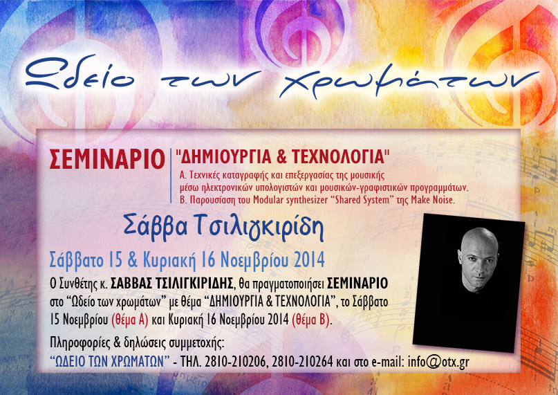 Ο Συνθέτης κ. ΣΑΒΒΑΣ ΤΣΙΛΙΓΚΙΡΙΔΗΣ, θα πραγματοποιήσει ΣΕΜΙΝΑΡΙΟ στο “Ωδείο των χρωμάτων” με θέμα “ΔΗΜΙΟΥΡΓΙΑ & ΤΕΧΝΟΛΟΓΙΑ”, το Σάββατο 15 Νοεμβρίου με θέμα "Τεχνικές καταγραφής και επεξεργασίας της μουσικής μέσω ηλεκτρονικών υπολογιστών και μουσικών-γραφιστικών προγραμμάτων" και την Κυριακή 16 Νοεμβρίου 2014, με θέμα "Παρουσίαση του Modular synthesizer “Shared System” της Make Noise".Σάββας Τσιλιγκιρίδης