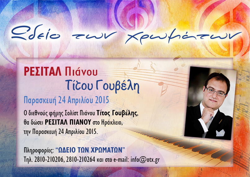 Ο διεθνούς φήμης Σολίστ Πιάνου Τίτος Γουβέλης, θα δώσει ΡΕΣΙΤΑΛ ΠΙΑΝΟΥ στο Ηράκλειο, την Παρασκευή 24 Απριλίου 2015. Πληροφορίες: “ΩΔΕΙΟ ΤΩΝ ΧΡΩΜΑΤΩΝ” Τηλ. 2810-210206, 2810-210264 και στο e-mail: info@otx.gr