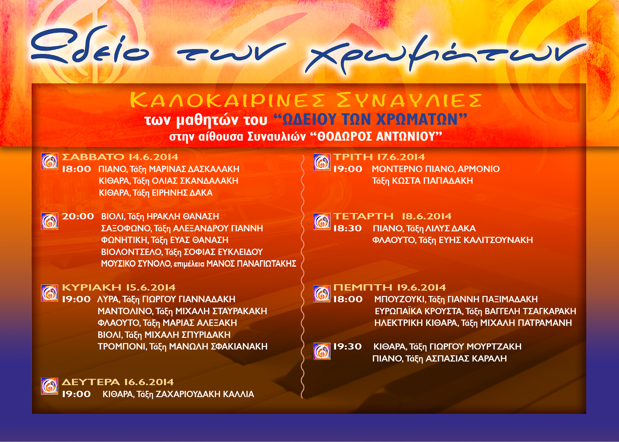 Οι καλοκαιρινές συναυλίες του "Ωδείου των χρωμάτων", ξεκινάνε το Σάββατο 14 Ιουνίου 2014 με την 1η Συναυλία των μαθητών μας και ολοκληρώνονται την Πέμπτη 19 Ιουνίου 2014, με την 8η κατά σειρά Συναυλία μας. Όλες οι Συναυλίες, θα πραγματοποιηθούν στην μεγάλη Αίθουσα Συναυλιών "ΘΟΔΩΡΟΣ ΑΝΤΩΝΙΟΥ", στο "Ωδείο των χρωμάτων", στη Λ. Δημοκρατίας 77, στο Ηράκλειο (δίπλα στο ξενοδοχείο GALAXY). |