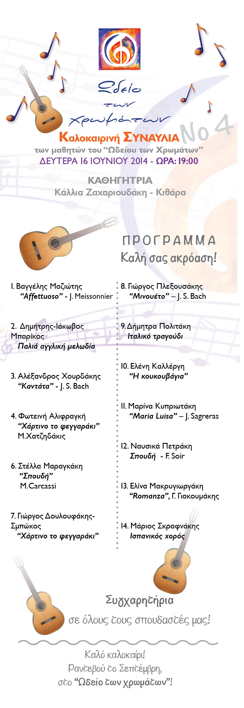 Θυμηθείτε την σημερινή Συναυλία μας! Δευτέρα 16 Ιουνίου, στις 19:00, στην αίθουσα Συναυλιών του "Ωδείου των χρωμάτων" ΘΟΔΩΡΟΣ ΑΝΤΩΝΙΟΥ, όλοι οι μαθητές της κυρίας Κάλλιας Ζαχαριουδάκη, στην ΚΙΘΑΡΑ!