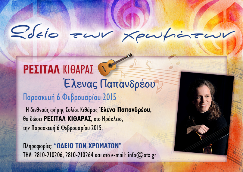 Η διεθνούς φήμης Σολίστ Κιθάρας Έλενα Παπανδρέου, θα δώσει ΡΕΣΙΤΑΛ ΚΙΘΑΡΑΣ, στο Ηράκλειο, την Παρασκευή 6 Φεβρουαρίου 2015.