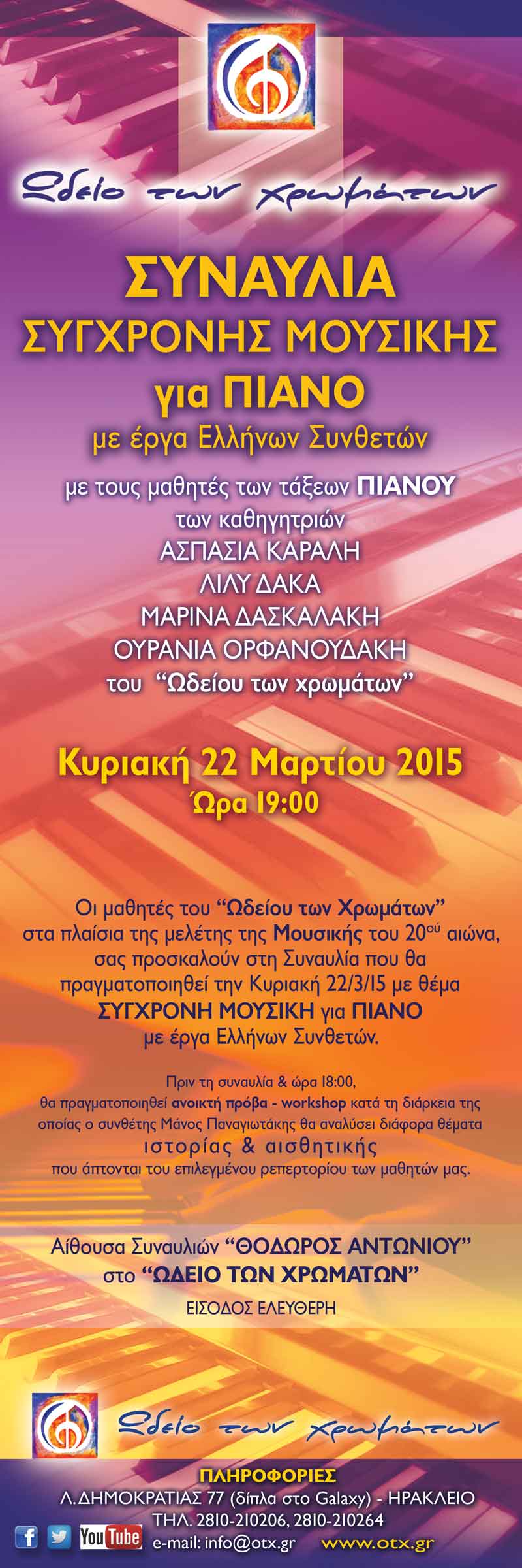 Οι μαθητές του "Ωδείου των χρωμάτων", στα πλαίσια μελέτης της Μουσικής του 20ου αιώνα, σας προσκαλούν στη Συναυλία που θα πραγματοποιηθεί την Κυριακή 22 Μαρτίου, με θέμα ΣΥΓΧΡΟΝΗ ΜΟΥΣΙΚΗ για ΠΙΑΝΟ με έργα ΕΛΛΗΝΩΝ ΣΥΝΘΕΤΩΝ, στις 19:00, στην Αίθουσα Συναυλιών "ΘΟΔΩΡΟΣ ΑΝΤΩΝΙΟΥ" στο "Ωδείο των χρωμάτων", με ΕΛΕΥΘΕΡΗ ΕΙΣΟΔΟ. Πριν τη Συναυλία αυτή, στις 18:00 θα πραγματοποιηθεί ανοικτή πρόβα - workshop κατά τη διάρκεια της οποίας ο συνθέτης & καθηγητής του "Ωδείου των χρωμάτων" Μάνος Παναγιωτάκης, θα αναλύσει διάφορα θέματα ιστορίας & αισθητικής που άπτονται του επιλεγμένου ρεπερτορίου των μαθητών μας.