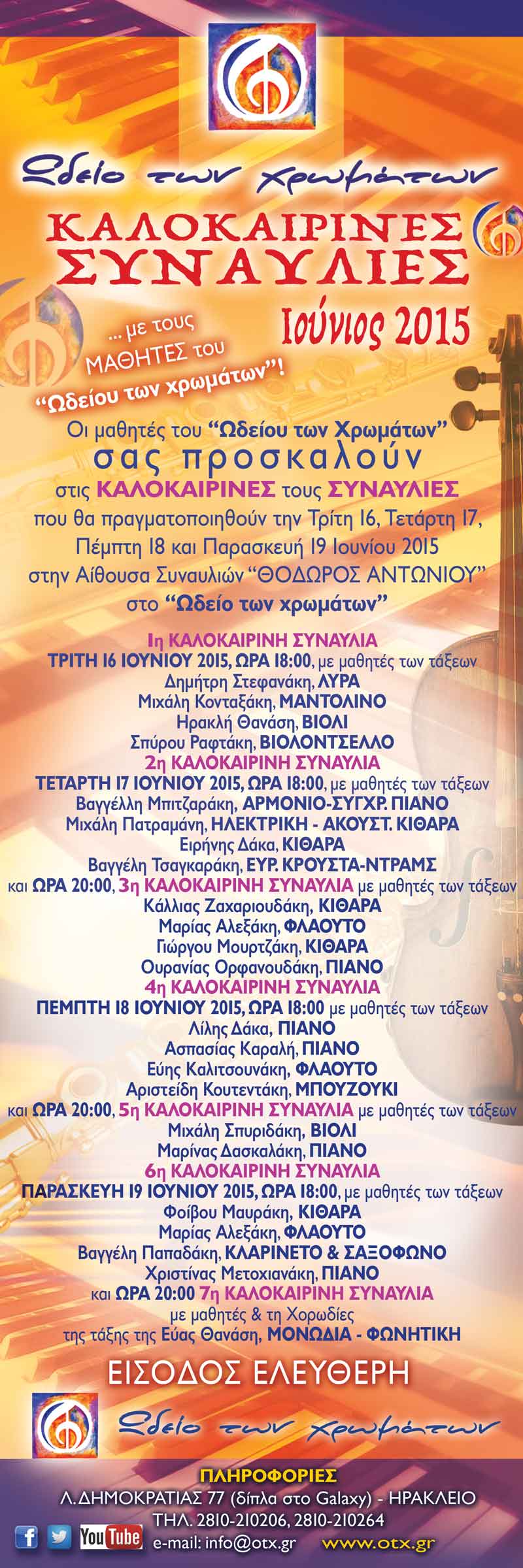 4η ΣΥΝΑΥΛΙΑ, την ΤΕΤΑΡΤΗ 18 ΙΟΥΝΙΟΥ 2015 και ώρα 18:00 με τους μαθητές των καθηγητών Λίλης Δάκα - ΠΙΑΝΟ, Ασπασίας Καραλή - ΠΙΑΝΟ, Εύης Καλιτσουνάκη - ΦΛΑΟΥΤΟ, Αριστείδη Κουτεντάκη - ΜΠΟΥΖΟΥΚΙ...και την ίδια μέρα η 5η ΣΥΝΑΥΛΙΑ, ώρα 20:00 με τους μαθητές των καθηγητών Μιχάλη Σπυριδάκη - ΒΙΟΛΙ, Μαρίνας Δασκαλάκη ΠΙΑΝΟ.