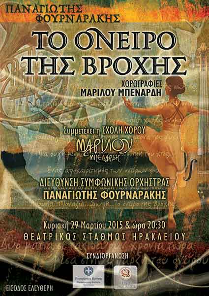 Συναυλία Συμφωνικής Μουσικής με το έργο του Παναγιώτη Φουρναράκη, "ΤΟ ΟΝΕΙΡΟ ΤΗΣ ΒΡΟΧΗΣ" και συμμετοχή της Σχολής χορού ΜΑΡΙΛΟΥ ΜΠΕΝΑΡΔΗ. Η Συναυλία, θα πραγματοποιηθεί την Κυριακή 29 Μαρτίου 2015 ΚΑΙ ώρα 20:30, στο ΘΕΑΤΡΙΚΟ ΣΤΑΘΜΟ ΗΡΑΚΛΕΙΟΥ, με τη συνδιοργάνωση της Περιφέρειας Κρήτης και του Δήμου Ηρακλείου. Διεύθυνση ΣΥΜΦΩΝΙΚΗΣ ΟΡΧΗΣΤΡΑΣ: ΠΑΝΑΓΙΩΤΗΣ ΦΟΥΡΝΑΡΑΚΗΣ. Χορογραφίες: ΜΑΡΙΛΟΥ ΜΠΕΝΑΡΔΗ. ΕΙΣΟΔΟΣ ΕΛΕΥΘΕΡΗ.