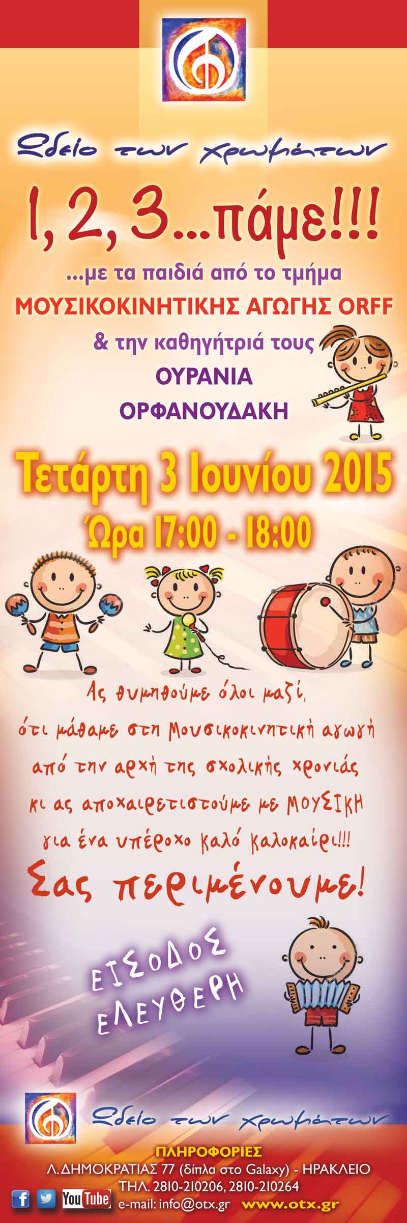Την Τετάρτη 3 Ιουνίου 2015 και ώρα 17:00 - 18:00, το τμήμα της Μουσικοκινητικής Αγωγής ORFF του "Ωδείου των χρωμάτων", πραγματοποιεί τη δική του Συναυλία - Ανοικτό μάθημα, με τους μαθητές του και την καθηγήτριά τους Ουρανία Ορφανουδάκη, με τίτλο...."1, 2, 3...πάμε!!!!". Ας θυμηθούμε λοιπόν όλοι μαζί, ό,τι μάθαμε στη Μουσικοκινητική αγωγή από την αρχή της Σχολικής χρονιάς κι ας αποχαιρετιστούμε με ΜΟΥΣΙΚΗ για ένα υπέροχο καλό καλοκαίρι! |