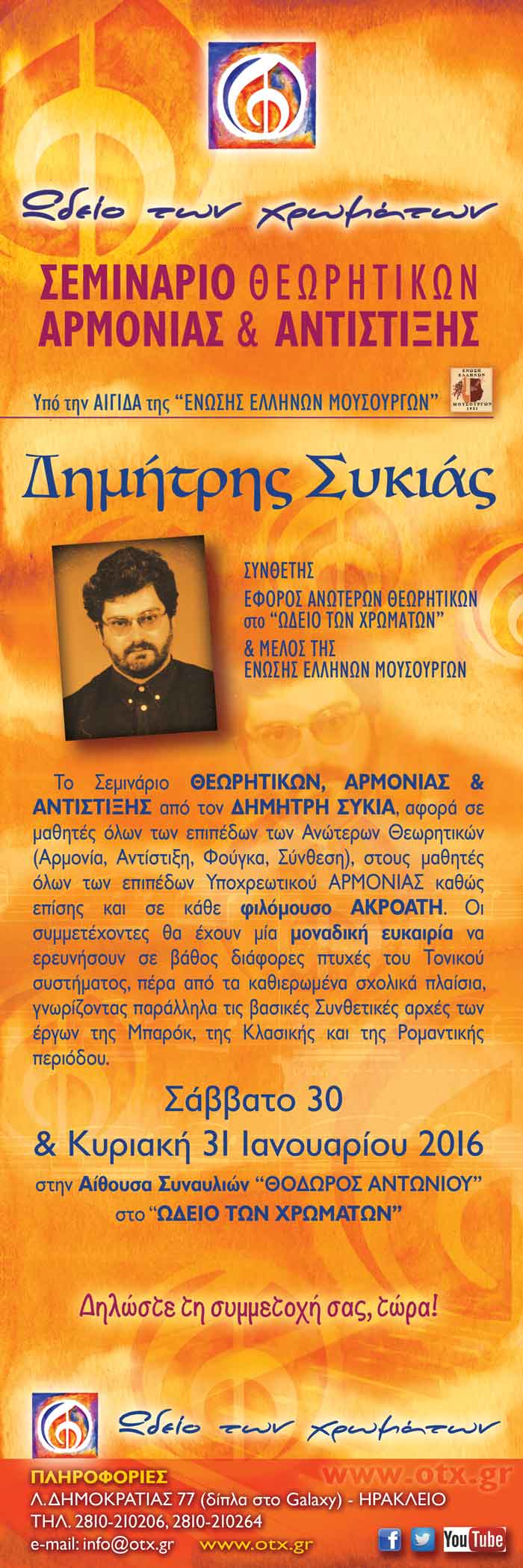 Πραγματοποιείται ΣΕΜΙΝΑΡΙΟ ΘΕΩΡΗΤΙΚΩΝ ΑΡΜΟΝΙΑΣ & ΑΝΤΙΣΤΙΞΗΣ με τον ΔΗΜΗΤΡΗ ΣΥΚΙΑ (ΣΥΝΘΕΤΗΣ, ΕΦΟΡΟΣ ΑΝΩΤΕΡΩΝ ΘΕΩΡΗΤΙΚΩΝ στο “ΩΔΕΙΟ ΤΩΝ ΧΡΩΜΑΤΩΝ” & ΜΕΛΟΣ ΤΗΣΕΝΩΣΗΣ ΕΛΛΗΝΩΝ ΜΟΥΣΟΥΡΓΩΝ), το Σάββατο 30 & Κυριακή 31 Ιανουαρίου 2016.
