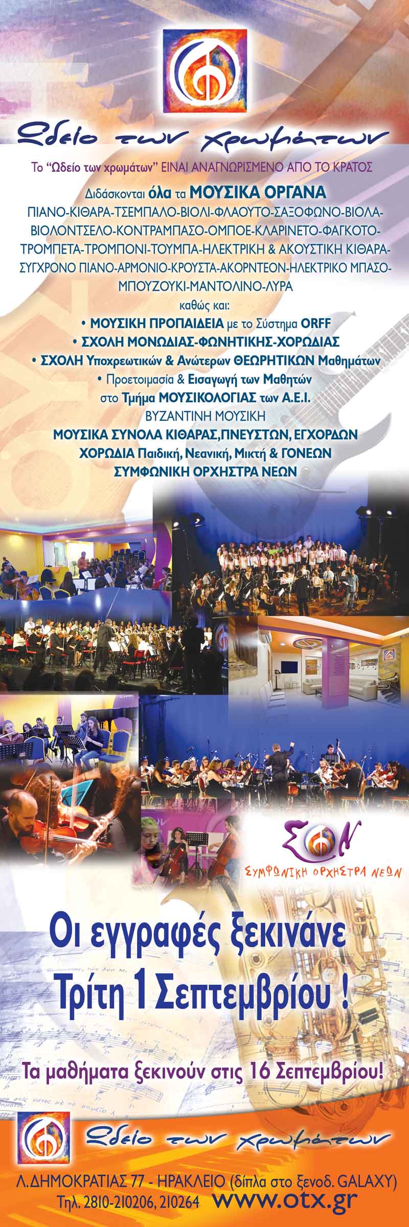 Περνάει ο καιρός, το Φθινόπωρο είναι γεγονός! Ξεκίνησαν από την Τρίτη 1η Σεπτεμβρίου 2015 οι εγγραφές στο "Ωδείο των χρωμάτων"! Και φυσικά σας περιμένουμε όλους, παλιούς & νέους μαθητές μας, για πληροφορίες, για να κλείσετε όποιες ώρες σάς εξυπηρετούν στα μαθήματά σας και να τα πούμε από κοντά πια! Καλή αρχή, καλό ξεκίνημα στις Μουσικές σας σπουδές!!! |