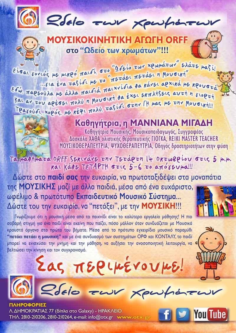 ΜΟΥΣΙΚΟΚΙΝΗΤΙΚΗ ΑΓΩΓΗ ORFF, στο “Ωδείο των χρωμάτων”!!! Δώστε στο παιδί σας την ευκαιρία, να πρωτοταξιδέψει στα μοναπάτια της ΜΟΥΣΙΚΗΣ μαζί με άλλα παιδιά, μέσα από ένα ευχάριστο, ωφέλιμο & πρωτότυπο Εκπαιδευτικό Μουσικό Σύστημα...Δώστε του την ευκαιρία, να “πετάξει”, με την ΜΟΥΣΙΚΗ!!! Γνωρίζουμε ότι η μουσική μέσα από το παιχνίδι είναι το καλύτερο εργαλείο μάθησης! Η πιο σοβαρή στιγμή για ένα παιδί είναι εκείνη που παίζει, πόσο μάλλον όταν συνδυάζεται με Μουσικά κρουστά όργανα στα πρώτα του βήματα. Μέσα από το πρότυπο εγχειρίδιο μουσικό παραμύθι “πετάει πετάει η μουσική” και με ένα συνδυασμό των συστημάτων OΡΦ και ΚΟΝΤΑΛΥ, το παιδί μπορεί να ενισχύσει την μνήμη και την μάθηση, να αυξήσει την ανοσοποιητική λειτουργία, να βελτιώσει την κίνηση και τον συγχρονισμό. Καθηγήτρια στη Μουσικοκινητική αγωγή Σύστημα ORFF είναι η Μαννιάνα Μιγάδη (Καθηγήτρια Μουσικής, Μουσικοπαιδαγωγός, Συγγραφέας, Δασκάλα ΧΑΘΑ ολιστικής θεραπευτικής ΓΙΟΓΚΑ, REIKI MASTER TEACHER, ΜΟΥΣΙΚΟΘΕΡΑΠΕΥΤΡΙΑ, ΨΥΧΟΘΕΡΑΠΕΥΤΡΙΑ, Οδηγός δραστηριοτήτων στην φύση). Τα μαθήματα ΜΟΥΣΙΚΟΚΙΝΗΤΙΚΗΣ ΑΓΩΓΗΣ - ORFF, ξεκινάνε την Τετάρτη 14 Οκτωβρίου στις 5 μ.μ. και κάθε ΤΕΤΑΡΤΗ στις 5 - 6 το απόγευμα!!!