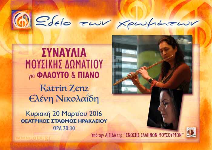 Την Κυριακή 20 Μαρτίου 2016, στις 20:30, στο ΘΕΑΤΡΙΚΟ ΣΤΑΘΜΟ ΗΡΑΚΛΕΙΟΥ, πραγματοποιείται από το "Ωδείο των χρωμάτων", ΣΥΝΑΥΛΙΑ ΜΟΥΣΙΚΗΣ ΔΩΜΑΤΙΟΥ για ΦΛΑΟΥΤΟ & ΠΙΑΝΟ με τις Σολίστ KATRIN ZENZ & ΕΛΕΝΗ ΝΙΚΟΛΑΪΔΗ. Πληροφορίες στα 2810-210206, 2810-210264.