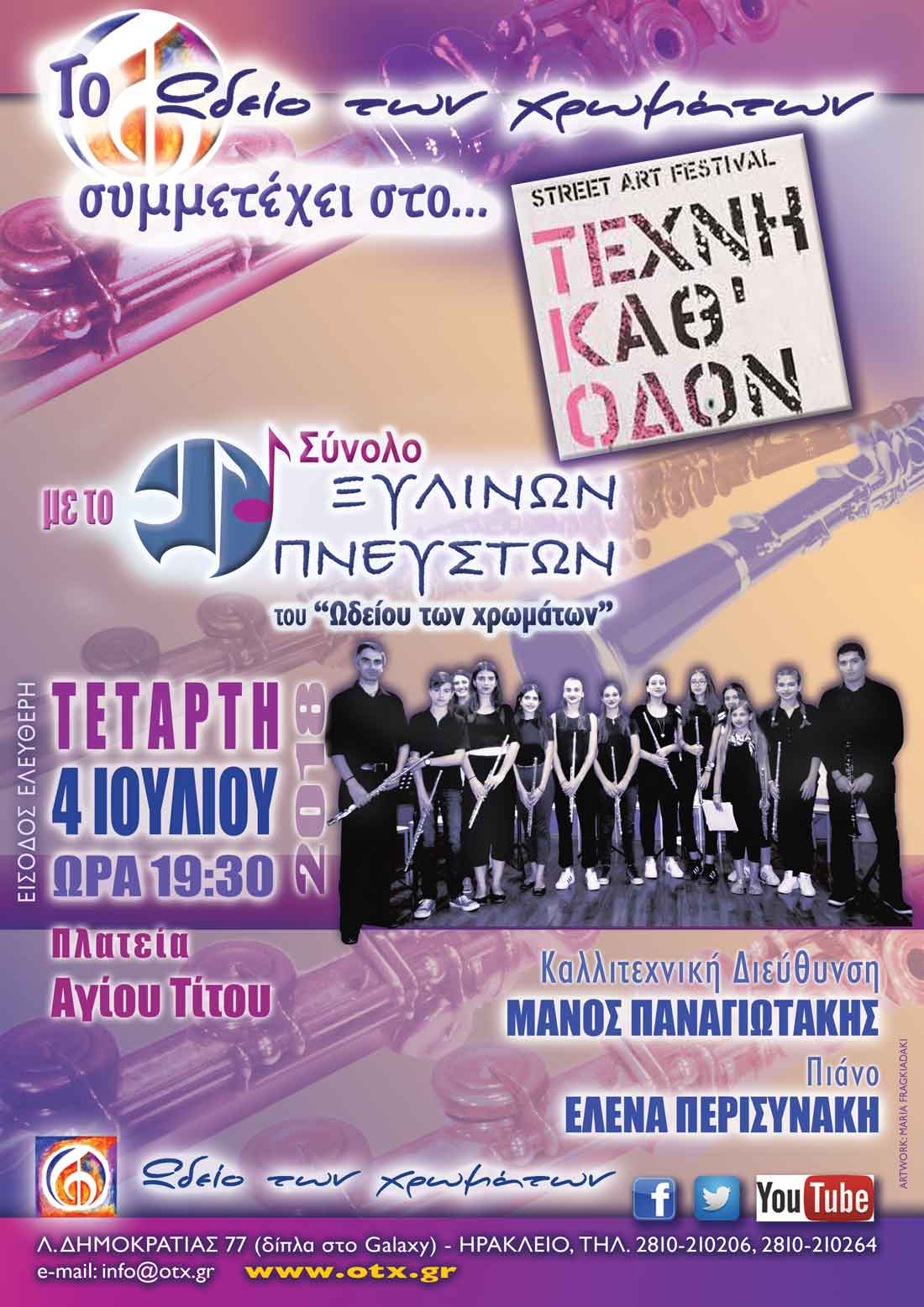Συμμετείχαμε λοιπόν και φέτος σαν "Ωδείο των χρωμάτων" στο "Τέχνη καθ' οδόν" ή "Street Art Festival" που διοργανώνει ο Δήμος Ηρακλείου Κ Α Ι με το "ΣΥΝΟΛΟ ΞΥΛΙΝΩΝ ΠΝΕΥΣΤΩΝ" την ΤΕΤΑΡΤΗ 4 ΙΟΥΛΙΟΥ στις 19:30 στην πλατεία του Αγίου Τίτου!