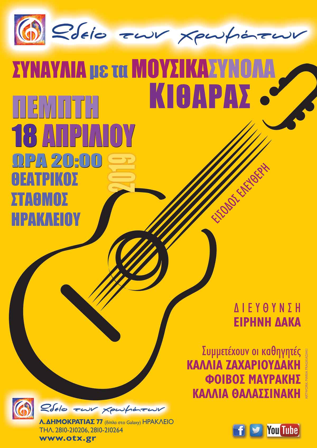 Τα ΜΟΥΣΙΚΑ Σύνολα ΚΙΘΑΡΑΣ του "Ωδείου των χρωμάτων" πραγματοποίησαν τη Συναυλία τους, την Πέμπτη 18 Απριλίου 2019, στις 20:00, στο ΘΕΑΤΡΙΚΟ ΣΤΑΘΜΟ ΗΡΑΚΛΕΙΟΥ.Διεύθυνση: ΕΙΡΗΝΗ ΔΑΚΑ.